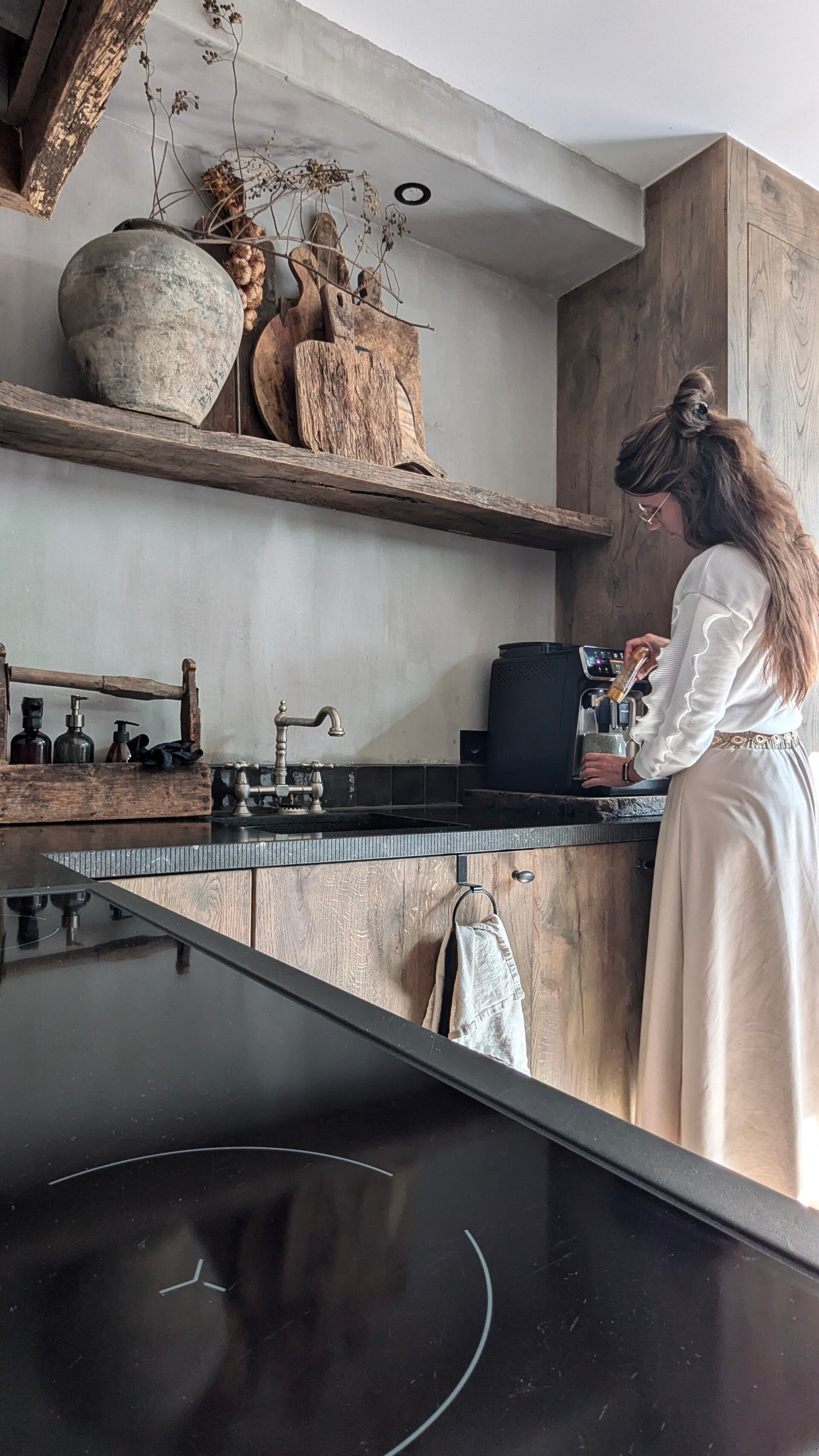 onze badkamer was dringend aan vervanging toe.. toen wij hier kwamen wonen was dat dat 1 van de wensen die zo snel mogelijk te doen. maar uiteindelijk deden we eerst de beneden verdieping en gingen daarna direct door naar de badkamer. in ons vorige huis hadden we ook beton cire aangebracht. alleen pakte dat daar niet zo goed uit. we kregen behoorlijke vochtplekken en helaas hadden ze vergeten nog een laag speciale coating te adviseren. nu wilde ik het toch weer en ook in de natte cel. t is altijd een risico, maar dit keer hadden we veel uitgezocht en goed gekeken naar de materialen. ook het schoonmaken van de betonstuc mag niet met elk schoonmaak middel, het liefst alleen water, maar 1x per maand gebruik ik groene zeep een heel klein beetje. en tot nu toe pakt het goed uit. het kan dus wel, maar we houden er rekening mee dat in de loop van de jaren de vochtplekken kunnen ontstaan in de natte cel. hier hebben we ook zeker rekening mee gehouden en de natte cel zou dan evt. betegeld kunnen worden. dit is redelijk simpel op te lossen. er zitten mooie balken in de badkamer die ik graag wilde bekleden met oud hout, ook zit er een klein schuin stuk onder het raam, deze wilde ik optimaal benutten hier hebben we dus gekozen voor kleine opbergruimtes met oude deurtjes ervoor. dit alles besprak dat met de timmerman die voor een deel onze badkamer zou doen, een vakken kast met daarin een wasmand en mooie vakken voor de handdoeken.. en daarnaast een zwevend badkamermeubel, de wasbak hadden we zelf geregeld bij tegeldepot.nl en kranen bestelde we bij Grohe en kozen voor een donkere chroom kleur, de spiegel is een verwarmde spiegel waardoor deze niet beslaat tijdens het douche en dus heel fijn is.