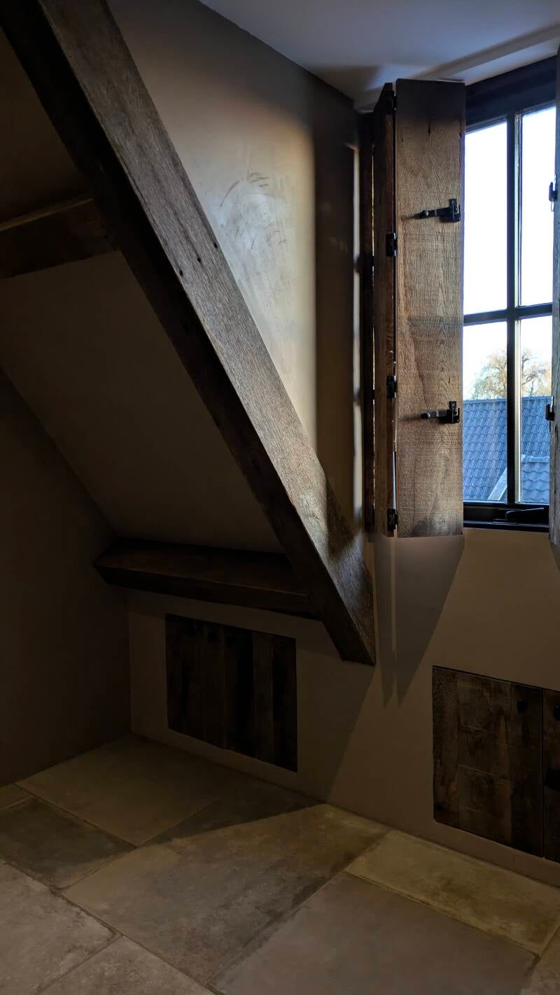 hier zie je de leuke oude houten luikjes om zo alles dicht te kunnen doen. t geeft extra sfeer aan de badkamer. al het hout hebben we bewerkt met een coating tegen het vocht.